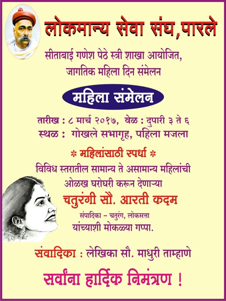 महिला दिनानिमित्त लोकमान्य संघातर्फे महिलांसाठी विशेष कार्यक्रम आयोजित करण्यात आले आहेत. लोकमान्य सेवा संघाच्या सीताबाई पेठे स्त्री शाखेने ८ मार्च रोजी महिला दिनानिमित्त विविध स्पर्धांचे आयोजन केले आहे. या प्रसंगी लोकसत्ताच्या ‘चतुरंग’ पुरवणीच्या संपादिका आरती कदम यांच्याशी मनमोकळ्या गप्पांचा कार्यक्रम आयोजित केला आहे.