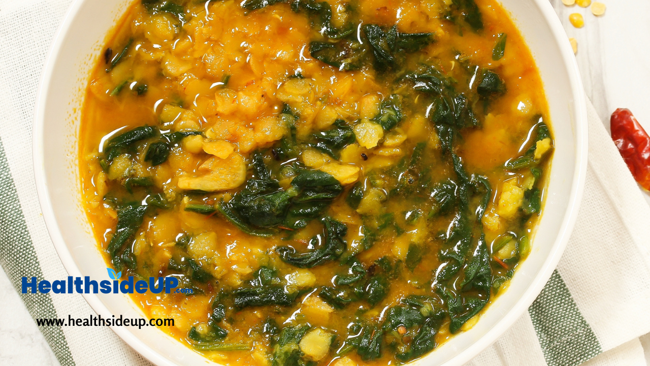 Dal Palak, or spinach lentil soup, is a nutritious Indian dish featuring yellow lentils (dal) cooked with fresh spinach, onions, tomatoes, and aromatic spices, providing a wholesome combination of protein, iron, and B vitamins, particularly folate, for a nourishing and flavorful meal.