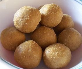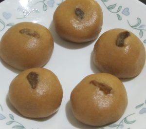 कृती – चवीपुरते मीठ टाकून व 2 टेबलस्पून तूप टाकून कणीक दुधात घट्ट भिजवावी. एक तासानंतर पिठाचे लहान मुटके करून ते खमंग तळून घ्यावेत. नंतर लगेचच मिक्सरमधून ते काढावेत. अशा तऱ्हेने सर्व मुटकुळे मिक्सरमधून काढावेत. (थोडे जाडसर) नंतर त्यात पिठीसाखर बेदाणे, चारोळी, वेलदोड्याची पूड घालून मिश्रण सारखे करून घ्यावे. नंतर तूप गरम करून त्यात घालावे आणि लाडू वळावेत.